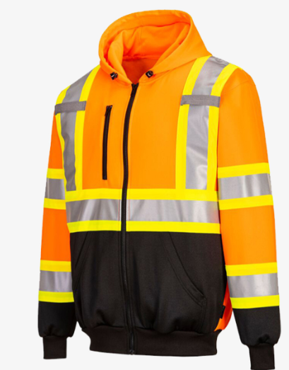 Regular price $63.99This hoodie uses a full zip to offer extra ease and versatility, while incorporating a two tone design for protection against dirt. Other features include 2 large pockets at the front, an adjustable hood for varied weather conditions, elasticated rib waistband and cuffs, and contrast reflective heat sealed striping for enhanced visibility. Meets CSA-Z96: 2022 compliant